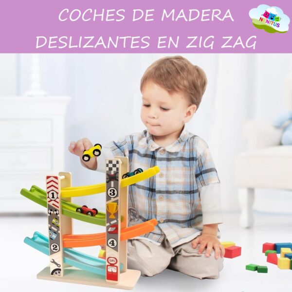 Sólo tiene que colocar el coche de carreras en la pista superior y ver cómo se desliza por la rampa en zigzag hasta la línea de meta; los colores brillantes y divertidos patrones atraerán a los niños durante horas de diversión.